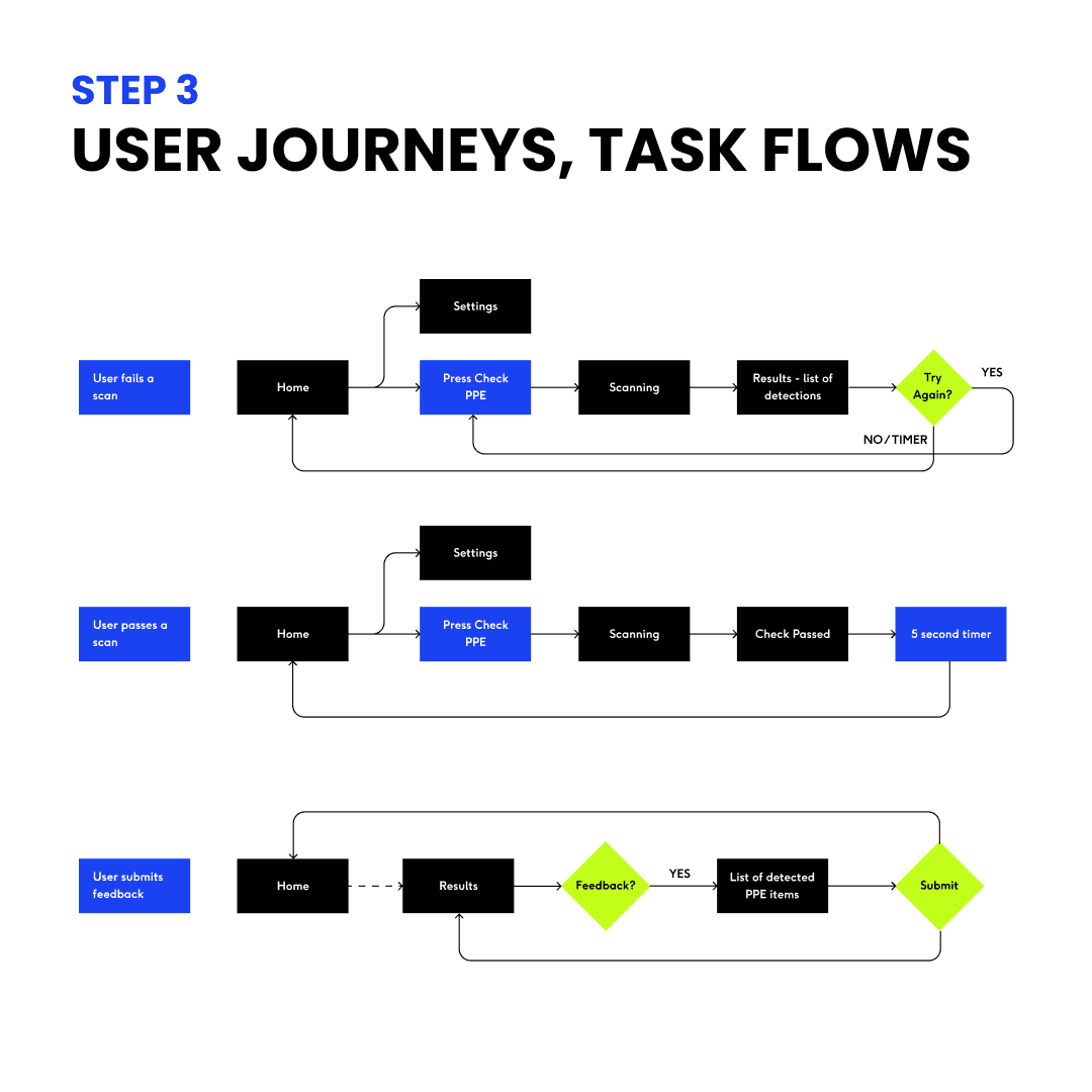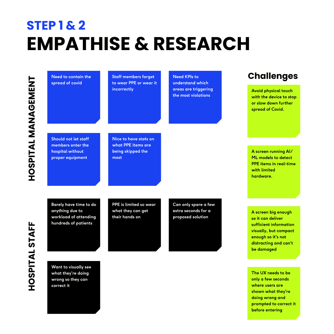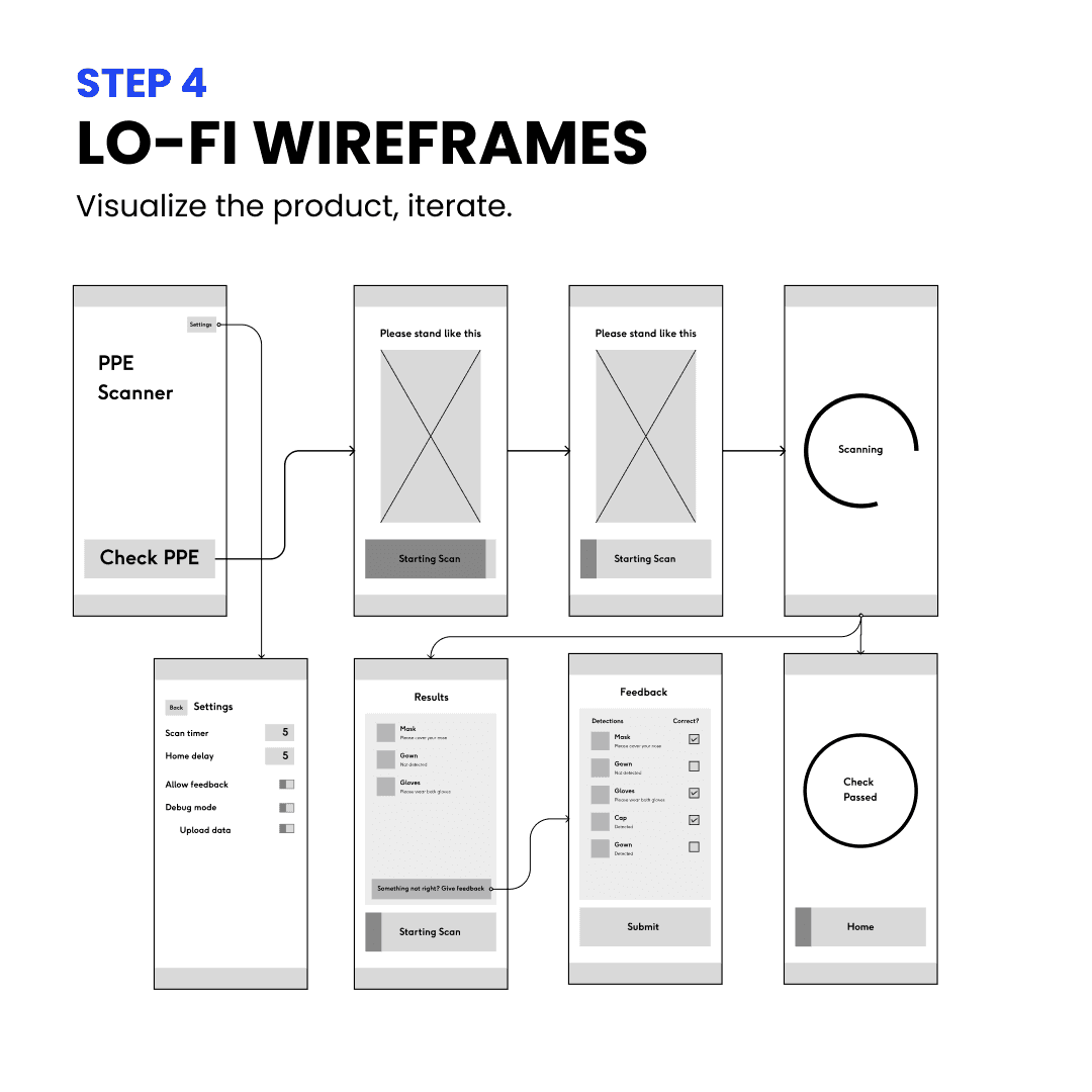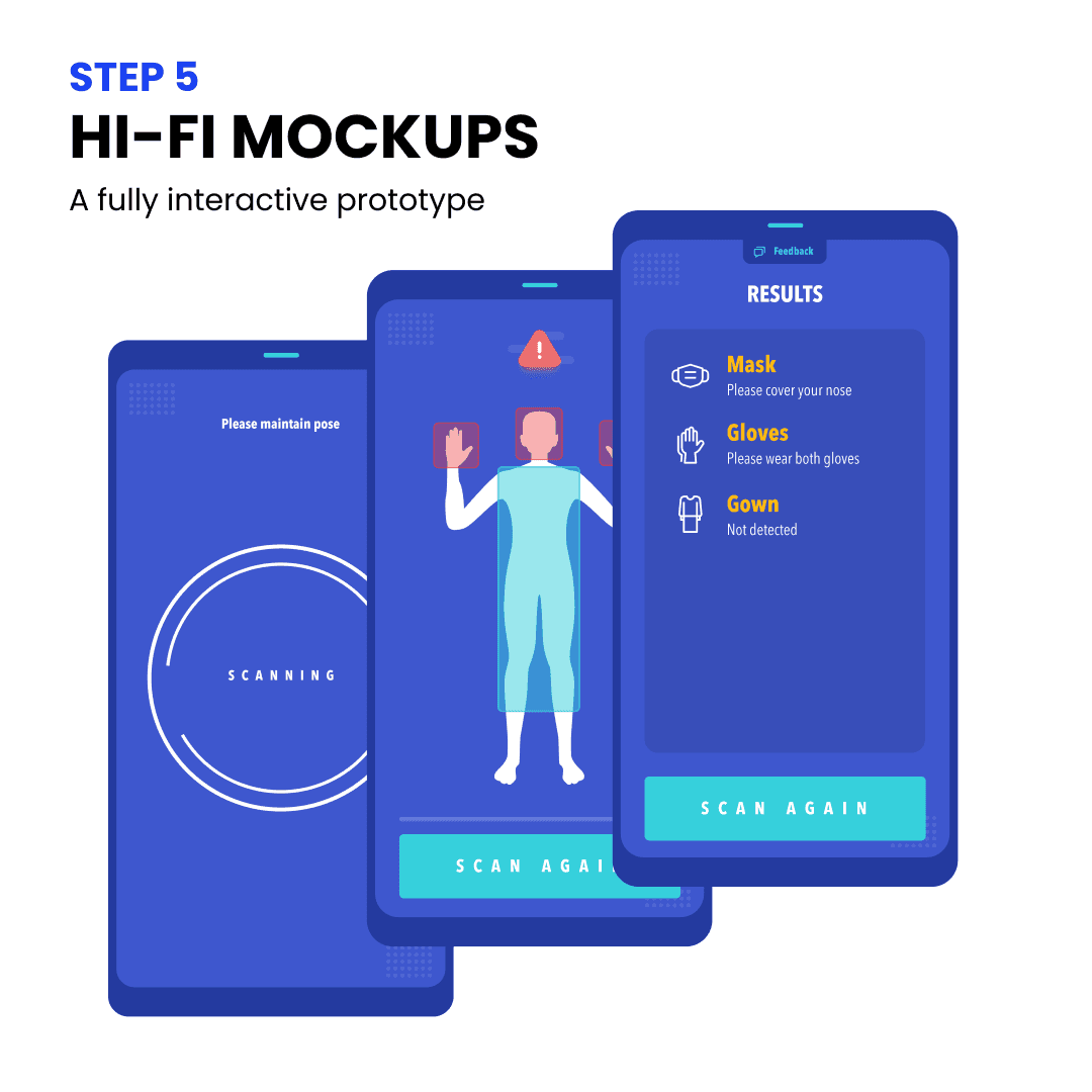 Lead a cross-functional team of designers and developers to develop the end to end experience for a mobile app that scans PPE items using the front camera. Conduct user interviews, prepare feature list and roadmap, draft user journeys, wireframe and deliver the final fully functional prototype for both iOS and Android.